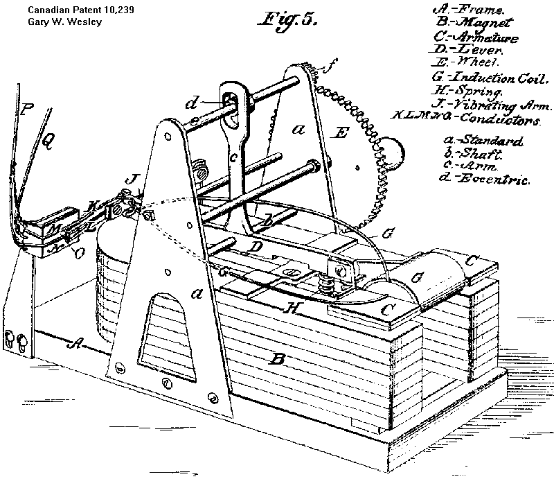 (The following illustrations come from Westley's Canadian patent for his generator shown in fig. 5, this drawing is not in the Harpers article but aids understanding. TV )