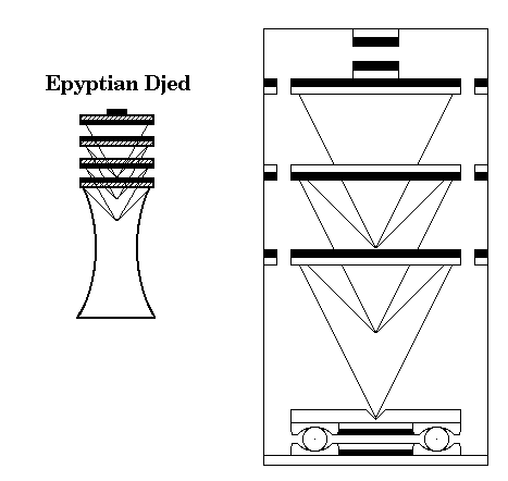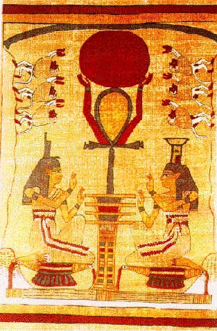 The two figures seem to be sitting on something either like aladdin type lamps maybe to indicate light or perhaps they look like birds possibly indicating flight. Or they could also be Egyptian rafts seemingly to indicate movement. I am usure what the wavy lines on each side represent maybe they indicate magnetic waves or water type ripples etc.