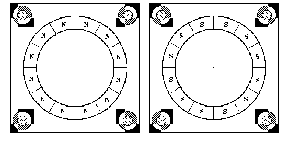 Hard to so say what these two diagrams but assume one plate sits on another with four rotating balls at the corners help to keep the two magnet arrays apart. expectecting more details on this shortly assuming the drawing are correct this would mean the magnets here are in an attraction arrangement..