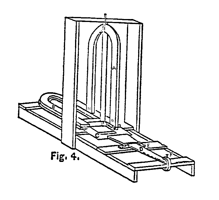 It is shown in Fig. 4. The letter A represents an upright magnet hung on a perpendicular shaft; B, the horizontal magnets; C, the soft iron whichis fastened to the lever D; E, the pivoted joint on which lever is balanced;and F, the thumb-screw for adjusting the movement of the soft iron.